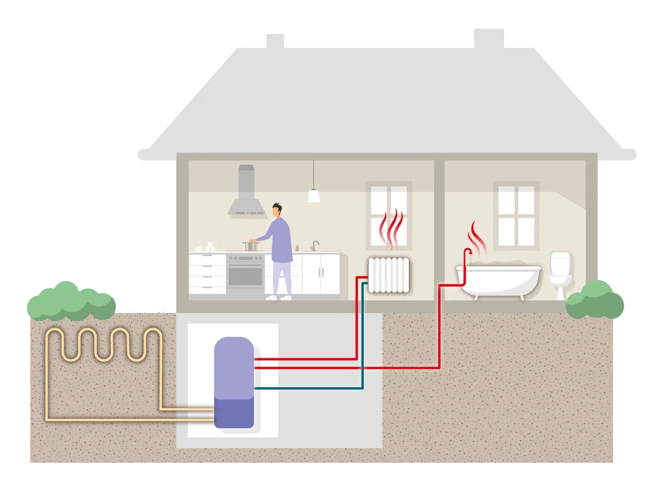 Principen när det gäller berg, sjö och jordvärme är densamma, man hämtar energi ifrån marken eller vattnet, energi som kommer från solen. Vid bergvärme så borras ett hål ner till berggrunden, där man sedan hämtar energi, medan man vid sjö & jordvärme gräver/lägger ner en behovsanpassad slinga under ytan eller marken. Värmepumpen pumpar ut nedkylt brine (sprit) genom slingan, då marken är varmare än det brine man pumpar ut så värms brinet upp och där med hämtar man värmeenergi.